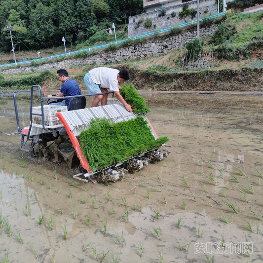 仲夏,西秀区蔡官镇广袤的田野间,一派繁忙景象。然而,与传统农忙时节不同,这里少见了农民弯腰弓背的辛劳身影,取而代之的是一台台插秧机在平整的水田中平稳驰骋。随着机械高效“吞吐”,一株株青翠秧苗被精准栽插入田,整齐划一,如同在大地上描绘出充满希望的绿色网格。