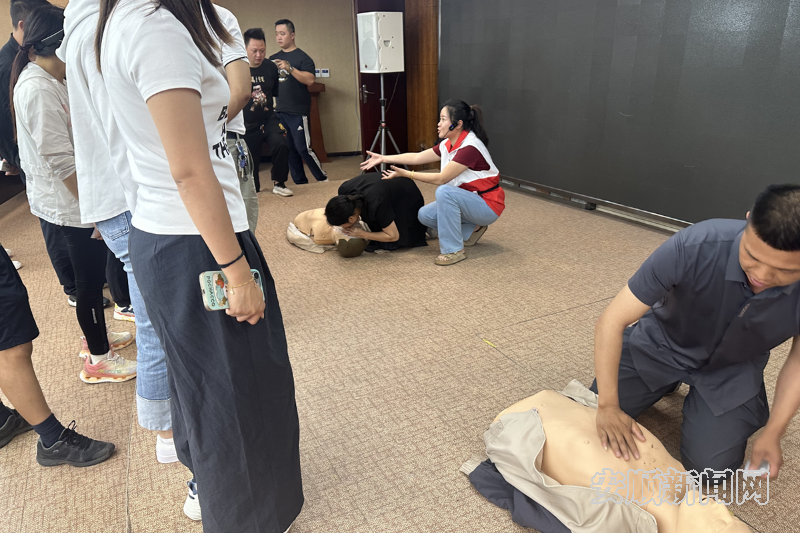 培训现场,邀请了安顺职业技术学院老师罗晓筠、姚安丽为学员教授理论和实操两门课程。理论课上,老师深入浅出地阐释了心肺复苏术的概念,并重点围绕心肺复苏(CPR)的救护步骤和自动体外除颤器(AED)的操作使用进行系统详尽的讲解。为使学员们更直观地感受和掌握急救要领,实操课程上老师带领大家进行了心肺复苏、自动体外除颤器模拟演示,并对学员进行应急救护的动作及流程进行纠正和规范指导,切实加强学员对急救要领的理解和掌握。