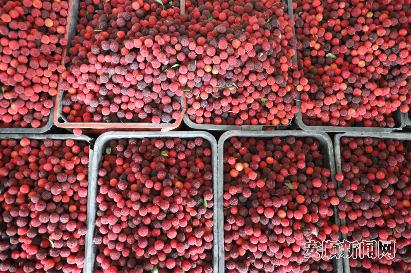 与窑上村传统种植模式不同,相距不远的木志河村则采用规模化种植发展杨梅产业,杨梅种植基地里,十多名工人正穿梭于林间,手法娴熟地采摘杨梅。新鲜的杨梅将分筐装载上车,发往食品加工厂和安顺市周边水果市场。