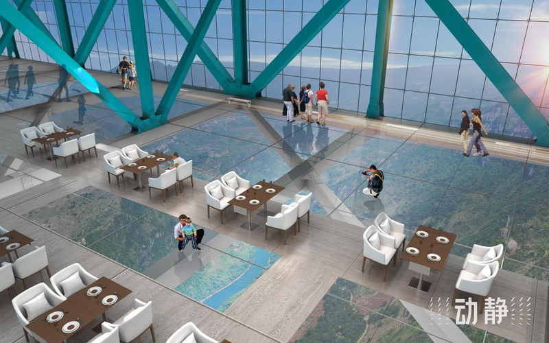 正在建设的观光电梯位于主塔塔柱一旁,高207米,相当于70层楼的高度。通过电梯到达大桥顶部后,游客所处位置距离峡谷底部的北盘江江面约800米。根据目前的招商情况,塔顶将成为一家高空咖啡厅。