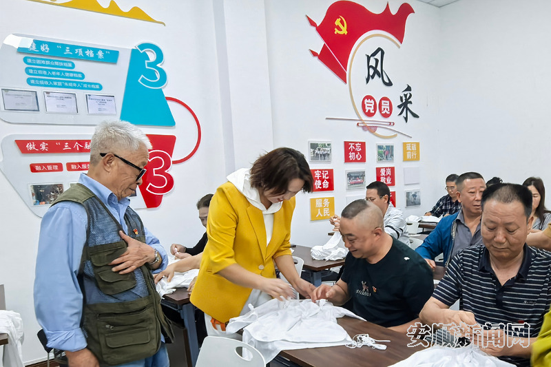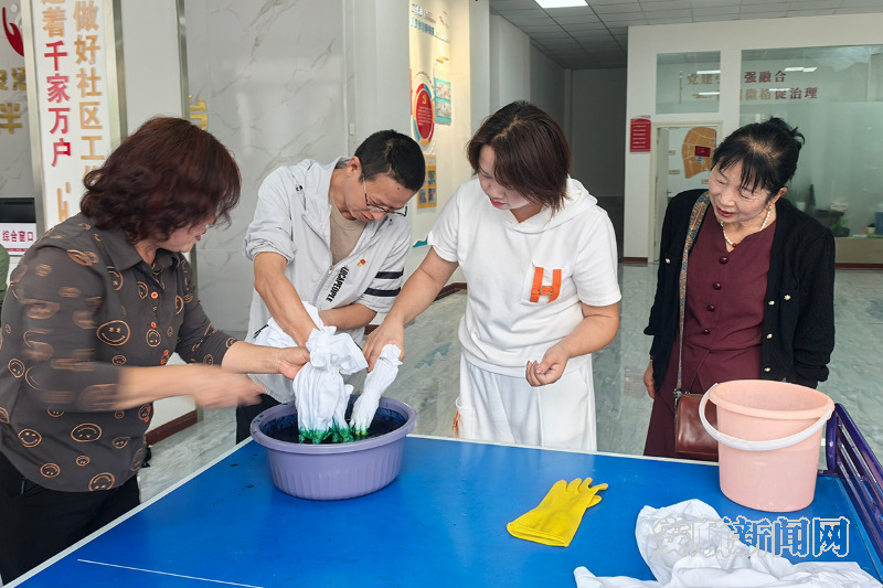 省级工艺美术大师、安顺市级蜡染非遗传承人杨婷婷受邀为居民们带来一场生动的蜡染知识讲座,深入浅出地讲解了蜡染的历史渊源、文化内涵和工艺流程。实践环节,在非遗传承人的悉心指导下,居民们纷纷动手尝试扎染技艺,把白色T恤折叠后用棉线紧紧捆扎固定,再将捆扎好的布料浸入靛蓝色的染料中。染好的布料经拆线、展开清洗,呈现出深浅不一、层次丰富的蓝色花纹和独特的冰裂纹理,因折叠方式、捆扎松紧的不同而独一无二,现场充满了赞叹声和欢笑声。