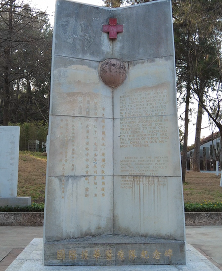 碑前矗立着5个人像雕塑,在塑像不远处,还有一处国际援华医疗队纪念碑。碑的正面和左右两侧有中英文对照的碑文和名单,纪念碑的上方,有一个地球形状的浮雕,上面用红色大理石雕刻了一个国际红十字会的会徽,象征着国际主义和人道主义精神。