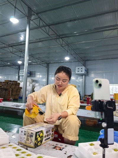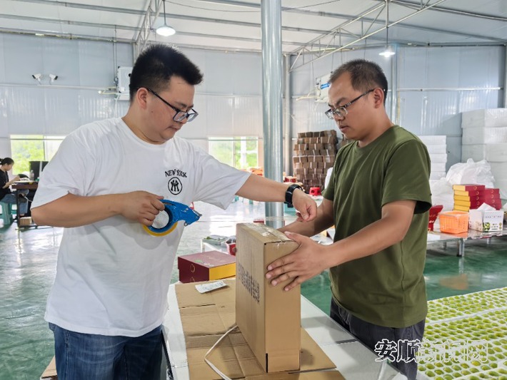 贵州弄染红色文化研学旅行有限公司总经理陈师正在分拣中心直播