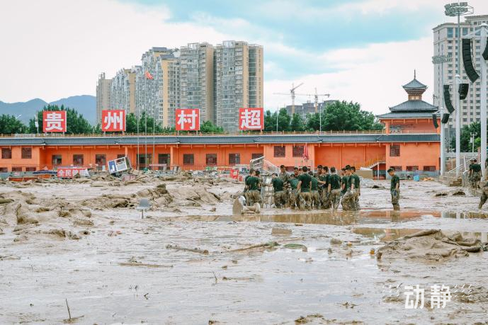 武警官兵在贵州村超球场进行清淤工作