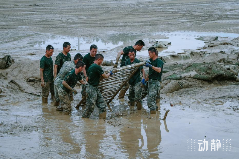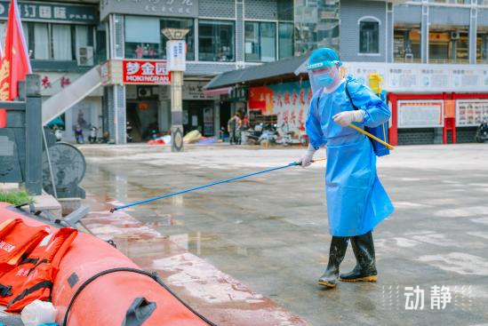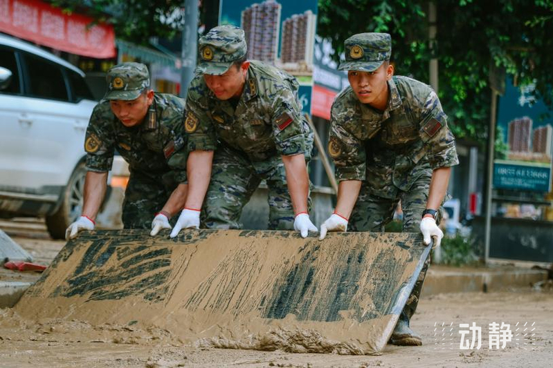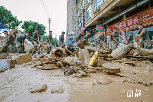 民兵在榕江县受灾街道进行清淤工作