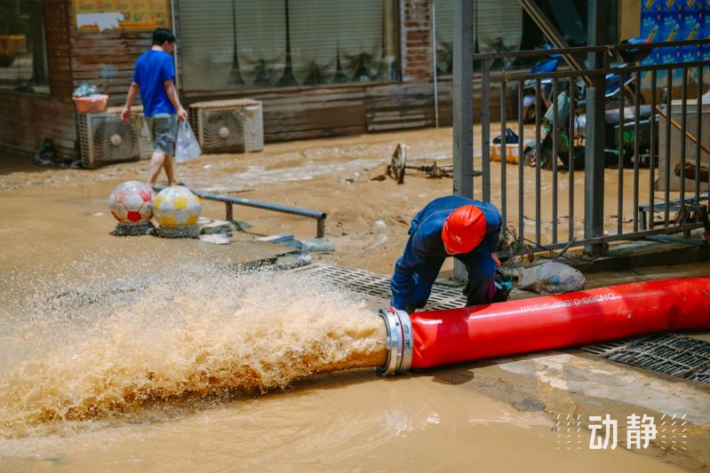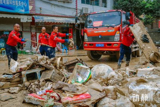 救援队在榕江县街道进行清淤工作