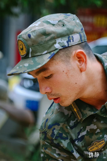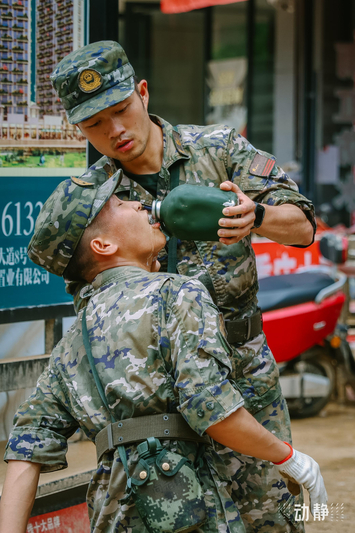 救灾现场,一位支援官兵托起水壶,让刚搬完垃圾、双手沾满污泥的战友喝上清水。