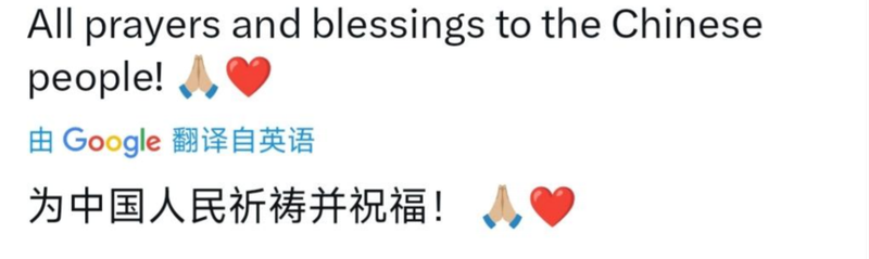 当然,更多的是祝福的声音:“这真是令人难过。希望大家都平安”,“为中国人民祈祷并祝福!”
