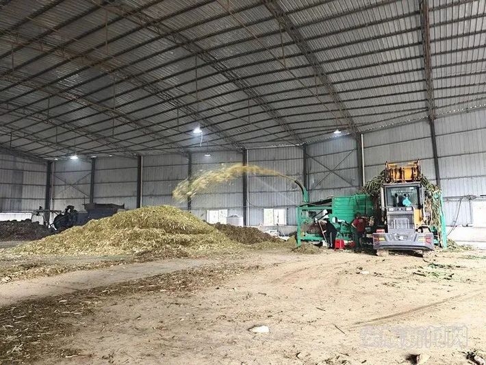贵州志成三合牧草有限公司加工厂内,工人正在处理加工回收的秸秆。