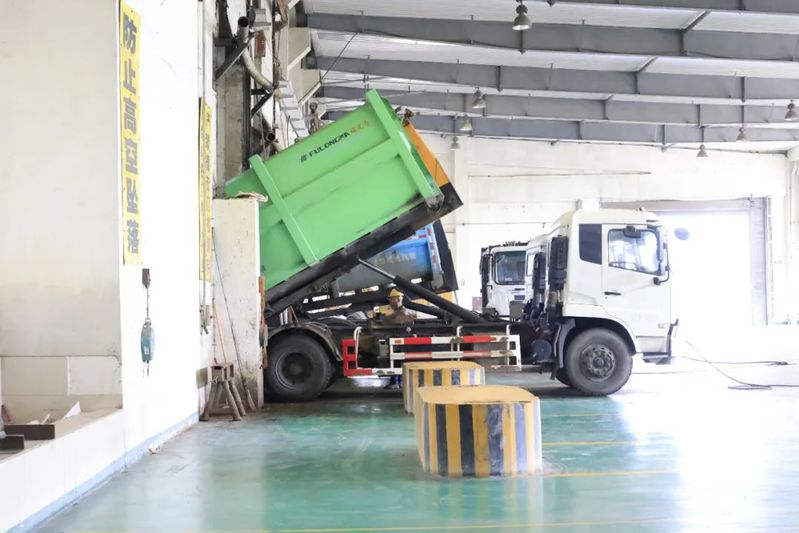 垃圾处理回收站内,垃圾车倾泻垃圾。