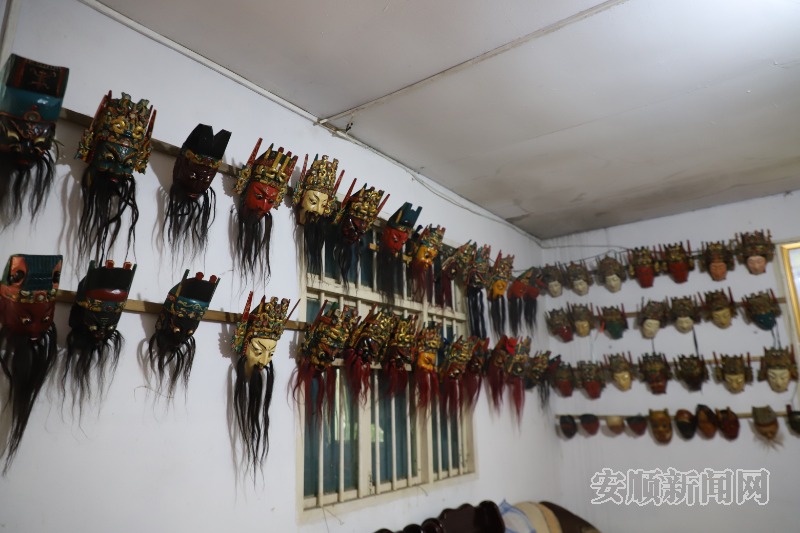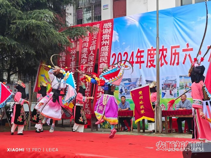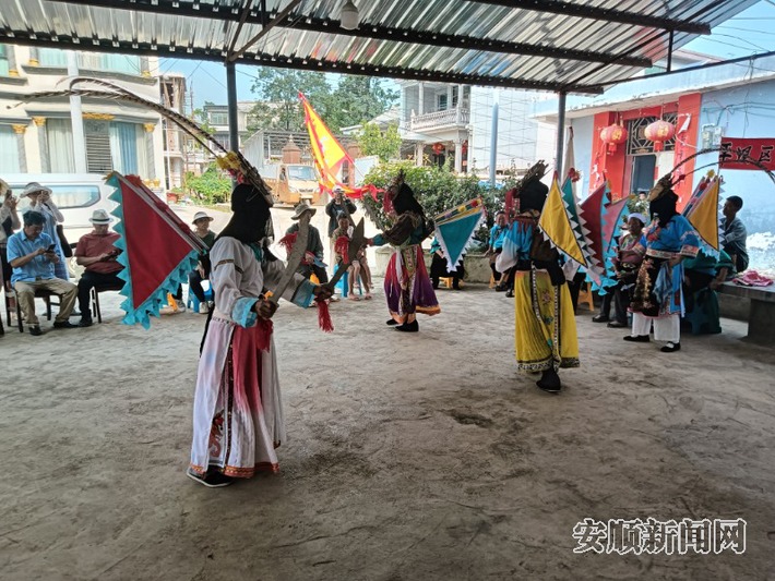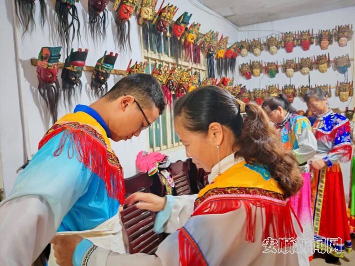 清晨的暖阳下,在平坝区天龙镇兴旺村双硐组的老体活动中心,一群身着彩色战袍、头戴木雕面具的女性地戏表演者正舞动长枪,唱腔高亢。这支由女性主导的地戏队正以独特的方式续写着屯堡文化的传奇。