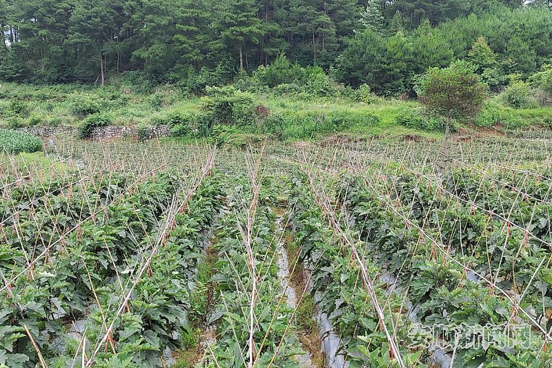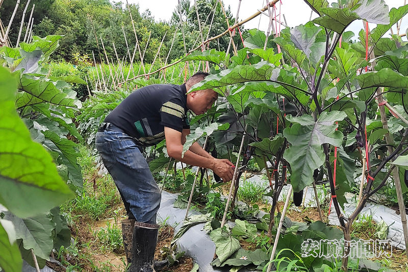 在屯寨村万马河组,小河这边成片的茄子迎来采收期,河对岸的一片丝瓜地郁郁葱葱,黄色的瓜花和嫩绿的果实缀满藤蔓。村里的菜农郑勇正带着工人把茄树下部分的叶子摘除,帮助茄树快速生长。他高兴道:“这季茄子产量还行,一亩估计要收2.5万斤左右。”