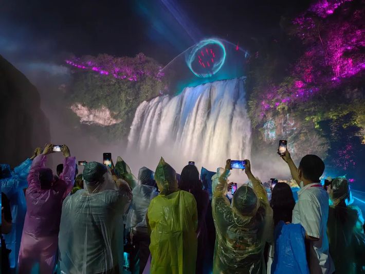 乘坐观光大扶梯,文化组的嘉宾开始夜游黄果树。作为国内首个以自然峡谷打造的沉浸式夜游地,该项目以大瀑布为核心,融合舞美、灯光、音响与裸眼3D等科技,将瀑布装点得如梦如幻。