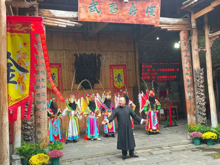 天龙屯堡景区的演武堂内,地戏表演开始。