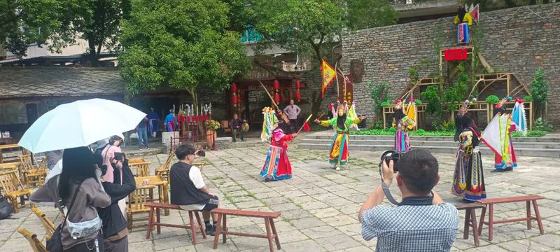 随着一阵阵锣鼓声响起,一台名为《三英战吕布》的地戏在天龙屯堡景区的“演武堂”精彩上演。演员们头顶面具,面罩青纱,背插小旗,手持刀、枪等兵器,在铿锵的锣鼓伴奏中相互唱、和、舞、打。在这里,喝一口大碗茶,观一场安顺地戏,被游客当成是到安顺天龙屯堡旅游必打卡的项目之一。“仿佛被拉回金戈铁马的战场。”在观看表演后,来自贵阳的游客吴小红发出了感慨。