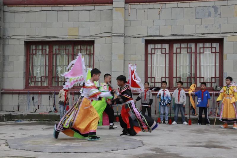 随着一阵清脆的上课铃声响起,天龙镇中心小学的红领巾地戏小社团里热闹非凡。学生们在辅导员的指导下,迅速换服装、搬大鼓、提铜锣、拿双枪,来到学校操场上站好各自的位置,准备练习台步、唱腔与身段。