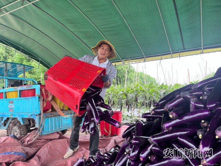 清晨的薄雾还未散尽,西秀区黄腊乡羊边城村的茄子种植基地里早已热闹起来。露水打湿了田埂,却挡不住工人们忙碌的脚步,三四十位村民挎着篮子穿梭在翠绿的茄枝间,指尖翻飞间,一个个紫得发亮、饱满圆润的茄子便被麻利地摘下,轻轻放入篮中。
