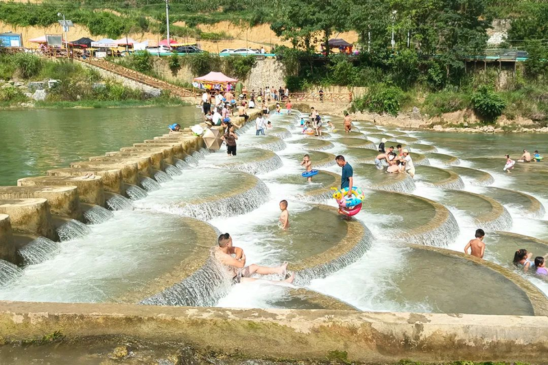盛夏七月,紫云自治县板当镇翠河村,沿着蜿蜒的河道铺展开来。沿河而行,河两岸绿油油的稻田呈现出一片生机勃勃的景象,河道中央的“滚水坝”成为大人孩子踏水嬉戏的避暑乐园,山涧的清冽气息驱散了酷暑的燥热。