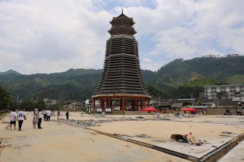 站在榕江县柳江广场鼓楼上,一眼望去,榕江县城尽收眼底,都柳江、寨蒿河、平永河三江交织成“城在江中”的独特景观。广场上,工人们正在建设排水沟、种植绿化苗木、修复鼓楼……