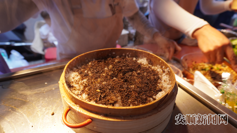 邹玉蓉来自西秀区大西桥镇,那里的屯堡人家都会制作松糕粑,她也传承了这道美食。今年,邹玉蓉看着顾府街小吃市场很火热,就和伙伴一起来到这个美食聚集地摆摊销售松糕粑,让更多人认识、喜爱家乡的美食。