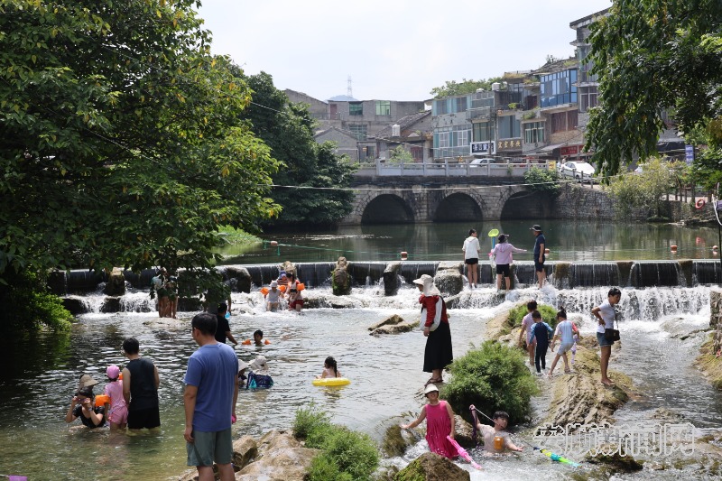 踏入村寨,桂家河如一条碧绿绸带穿寨而过,清澈的河水中倒映着两岸的青山绿树。沿河岸而行,百年石屋依山而建,层层叠叠,石墙缝隙间探出的三角梅开得正艳,轻风拂过,花香与清凉一同沁入心脾。“自2001年与旅游公司合作开发以来,我们就认准了‘山水+文化’这条发展道路。”石头寨村党支部书记伍小江说,如今避暑旅游品牌越擦越响,日均6000人次的客流里,超三成是来自川渝湘粤的“长住客”。