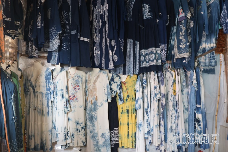 来自四川宜宾的唐先生一家已是第三次来到石头寨村避暑,在伍琴布依蜡染工作室内,他说:“这里气候凉爽,风光宜人。孩子每次来都会自己设计图案,动手制作蜡染,很有意义。”据了解,伍琴布依蜡染工作室每年夏季接待游客超2000人次,其蜡染服饰及文创产品年销售额达10万元左右。