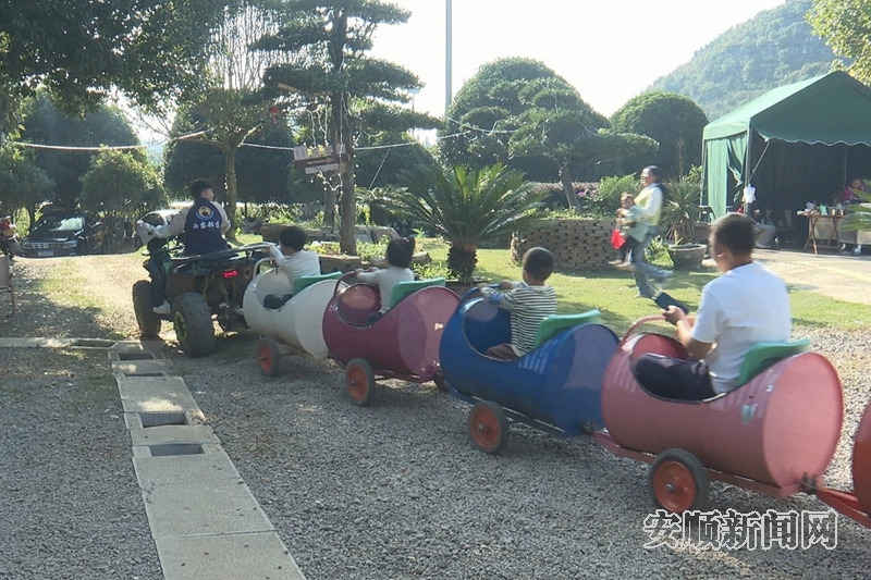 雨露部落露营基地里,小朋友们正在乘坐小火车。