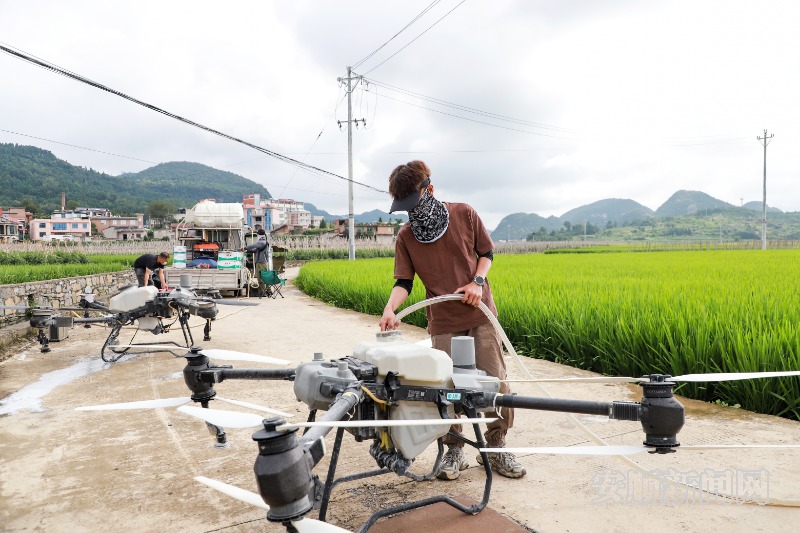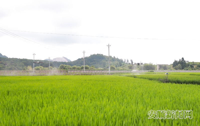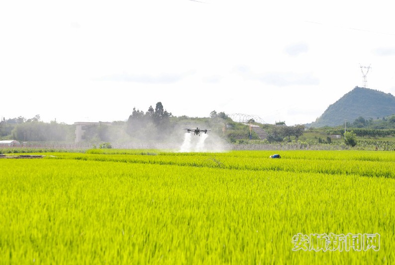 绿油油的稻田一望无垠。近日,在西秀区轿子山镇石锦村,两台植保无人机在机耕道上完成农药灌注后同时起飞,为3000亩稻油轮作田进行病虫害防治作业。