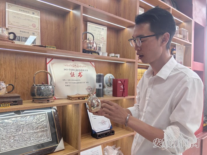 “这是手工锤制的茶杯,在传统技法的基础上,特意融入锤纹的肌理感。胡天文拿起一只手工锤纹茶杯展示道,灯光一照,锤纹熠熠生辉。胡天文还将珐琅工艺与屯堡银饰工艺融合,使银饰更加精致,更有新意。同时充分挖掘“银” 的多种用途,将其制作成保温杯、艾灸器、茶具、酒具等,屯堡银饰制作不再仅仅局限于传统的饰品、摆件领域。