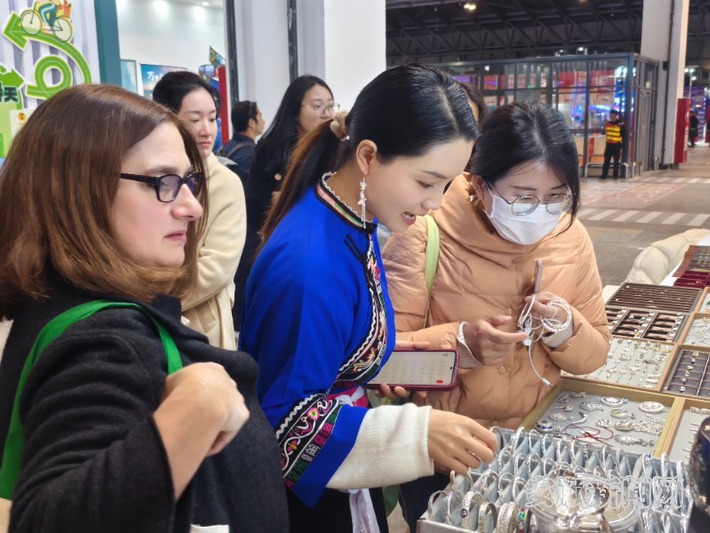 在安顺古城历史文化街区的屯堡人银饰展位前,来自四川、广州、江西等地的游客正精心挑选银制产品,打算买回家当纪念品,这个不大的展位每天营业额都能稳超万元。