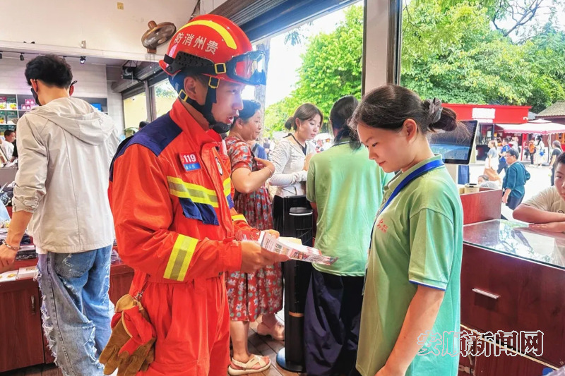 八月的安顺,山水如墨,游人如织。然而,当八方游客沉醉于这份“山水画卷”时,一群身着“火焰蓝”的身影,正默默穿行于人潮与热浪之中。他们或俯身检查消防设施,或检查民宿提醒安全用电,或巡逻景区角落为游客提供帮助,或驾着红色战车在山路间巡逻,构成了一道别样的风景线——一道用最严标准、最实举措为夏日旅游筑牢的安全防线。