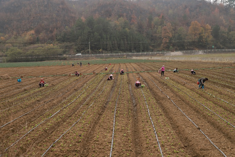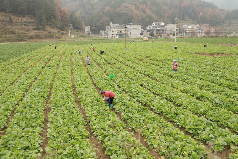 就近就业的工人在紫云坝羊镇红院村蔬菜地里采收蔬菜