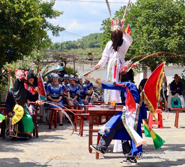 地戏展演环节更是将活动推向高潮。东屯乡梅旗地戏队《设朝》步态沉稳、唱腔浑厚;东屯乡地戏联谊会《下四将》动作利落、英气勃发;普定县马官镇张官屯小寨地戏队《点兵》气势恢宏,再现沙场点兵场面;东屯乡本寨女子地戏队《薛刚保唐》及“清水湾之声”舞蹈队表演的苗族舞蹈《贵客来》等节目,赢得观众热烈掌声。