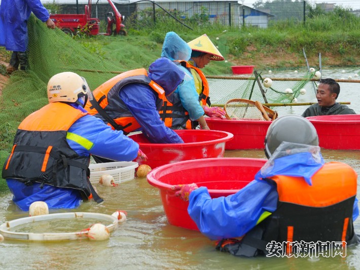 工人穿梭忙碌,一网网活蹦乱跳的罗氏虾被捞起