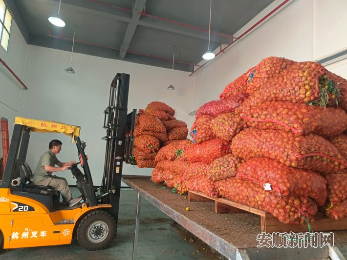 在刺梨汁加工车间外,刚收购的新鲜刺梨整齐码放,叉车往来穿梭,将一袋袋刺梨精准运送至车间;车间内,刺梨原汁自动化生产线高速运转,新鲜的刺梨经过去杂、去刺、搅碎、压榨等多道工序,清亮的刺梨原汁源源不断涌入储存罐。