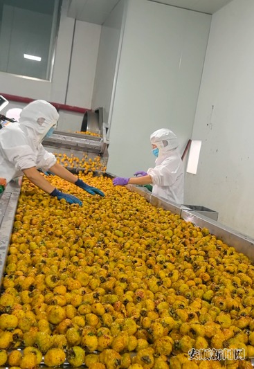 8月25日,紫云自治县白石岩乡农产品加工产业园内,机器轰鸣声与果香交织,工人们各司其职、有序作业,一片刺梨“抢鲜加工”的繁忙场景。
