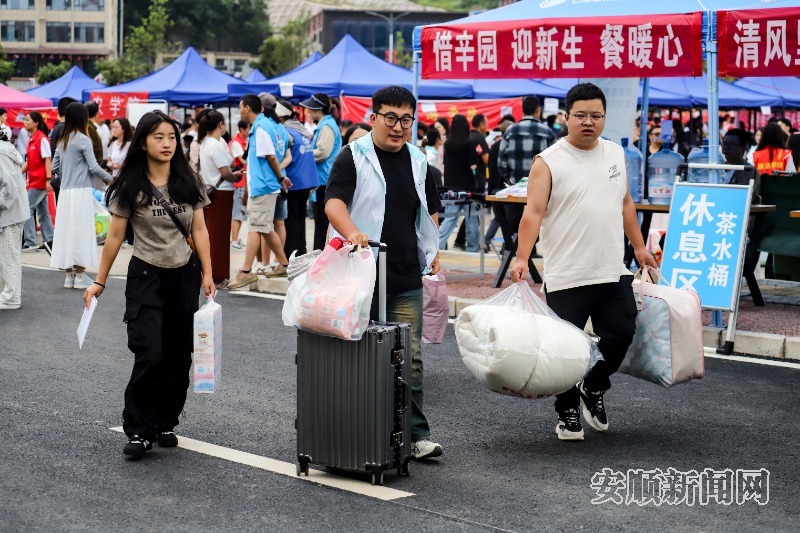 记者在安顺学院校园内看到,迎新氛围热烈而浓厚。彩色横幅、道旗迎风招展,“欢迎新同学”的标语随处可见。从接站引导到注册缴费,从宿舍安排到物资发放,从领取生活物品到搬运行李,全体志愿者、工作人员努力在每一个环节、每一处细节都让新生及家长感受到学校的温暖与关怀,为新生提供全方位贴心服务。