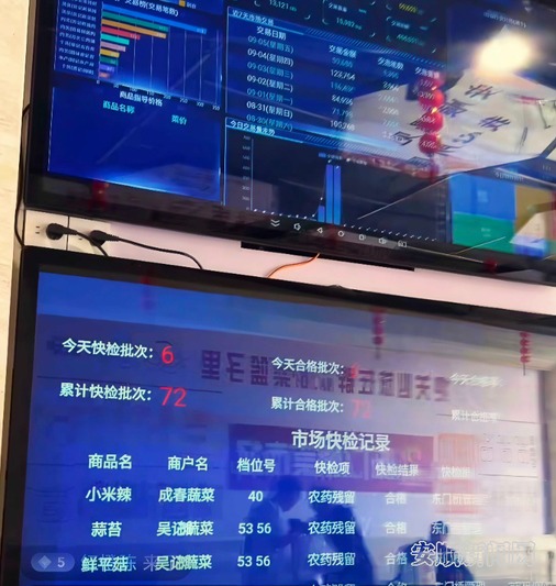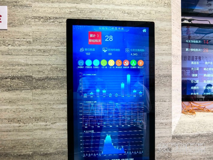 记者走进菜场看到,入口处的智慧大屏格外醒目,屏幕上实时滚动着当日农残快检结果、各摊位经营情况、热销商品排行等信息,交易数据实时上传管理后台,消费者扫码便可溯源。