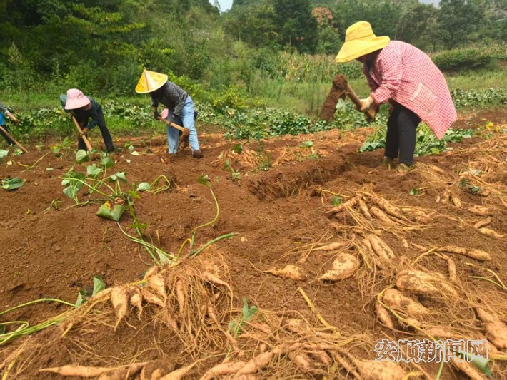 时下正是红芯红薯挖收季节。在白石岩乡干水井坝区,村民们分工协作,翻挖、去泥、分拣、装箱、搬运,一派丰收景象。