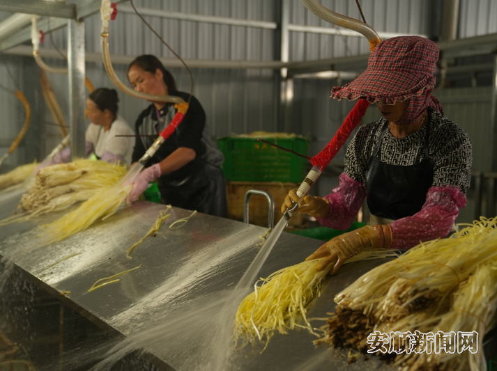 “今天采收的是今年的第一茬韭黄,预计能收割1万斤左右。目前工人的用工量比较大,收割加上清洗场每天需要70人左右。”贵州韭屹农业有限公司销售经理李文艳说。
