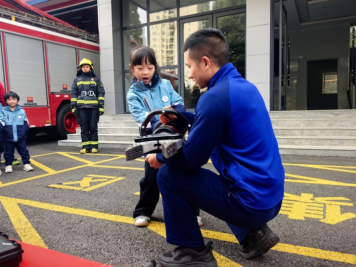 活动前,消防员精心准备,确保流程安全有序。红色的消防车一亮相就吸引了所有目光。从高压水炮到各类破拆工具、急救物资储存舱,消防员用浅显易懂的语言讲解车辆功能分区和装备用途。在确保安全的前提下,孩子们还轮流登上消防车,触摸方向盘、观察操作面板,亲身感受“移动救援堡垒”的魅力。