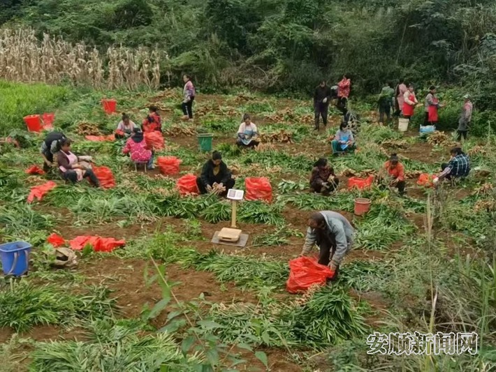 金秋时节,黔中大地硕果飘香。走进镇宁自治县宁西街道果寨村的生姜种植基地,一派繁忙的丰收景象映入眼帘:连片的姜田里,翠绿的姜叶随风摇曳,村民们弯腰俯身,熟练地进行拔姜、砍叶、去泥、装筐等工作。一串串饱满肥硕、色泽鲜亮的小黄姜被整齐装箱,即将通过订单销往全国各地,成为村民们增收致富的“黄金姜”。
