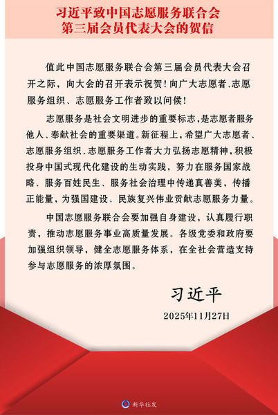 新华社北京11月28日电 在中国志愿服务联合会第三届会员代表大会召开之际,中共中央总书记、国家主席、中央军委主席习近平发来贺信,向大会的召开表示祝贺,向广大志愿者、志愿服务组织、志愿服务工作者致以问候。