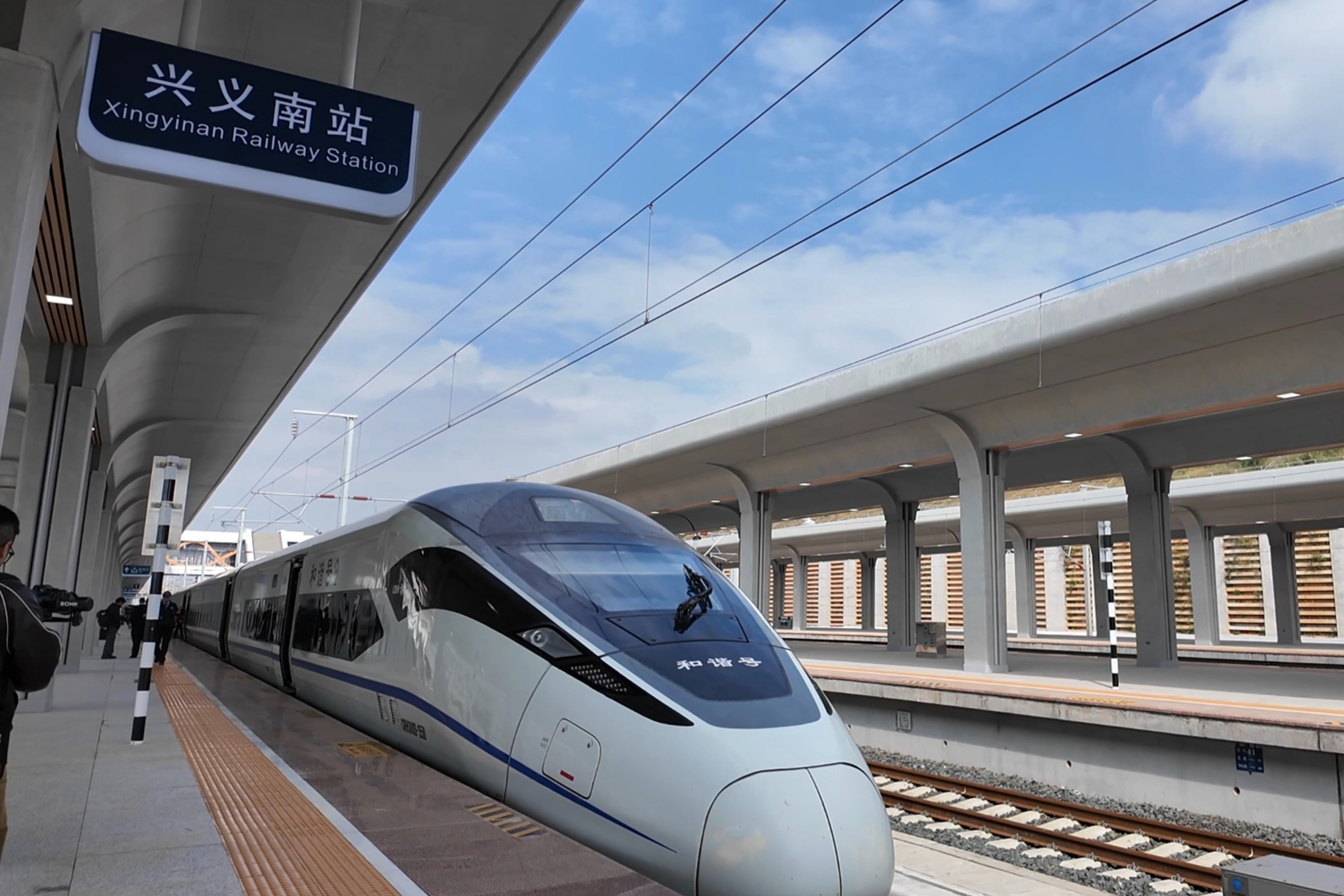 11月28日,一列和谐号动车组从兴义南站驶出,标志着盘兴高铁正式开通运营。