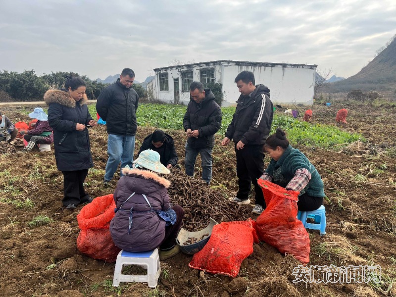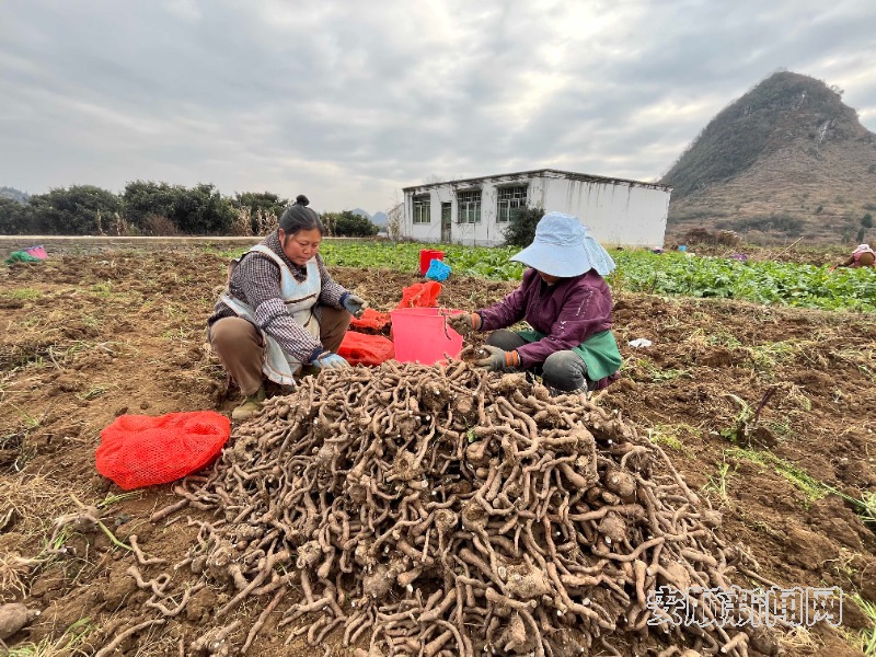 寒冬时节,普定县白岩镇韭黄村的魔芋种植基地里一片繁忙景象。70余名工人穿梭在田间,挥舞锄头采挖、分拣、搬运,一个个硕大饱满的白魔芋从泥土中破土而出,田垄上铺满了沉甸甸的“致富果”,空气中弥漫着丰收的喜悦。