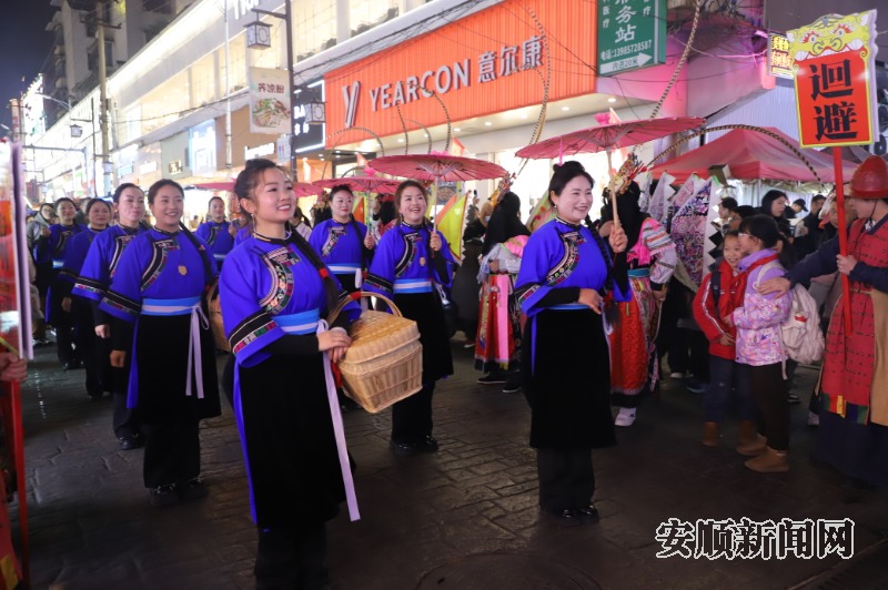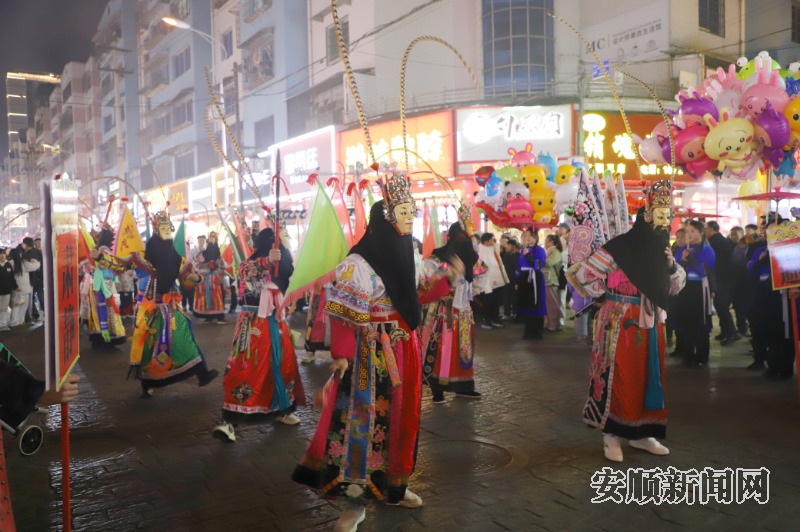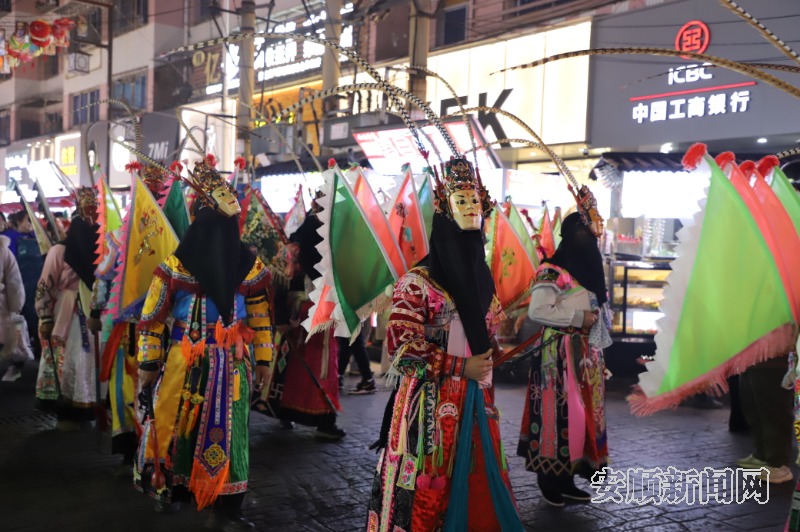 演出以一场独具特色的“顾成巡游”开启序幕,游行队伍身着地戏服饰,从书场启程,沿着顾府街前行,士兵整队、屯堡小嬢嬢互动、地戏展示、回营情景演绎轮番上演,表演者们融合安顺地戏元素,再现历史画面,吸引市民和游客纷纷驻足拍照。