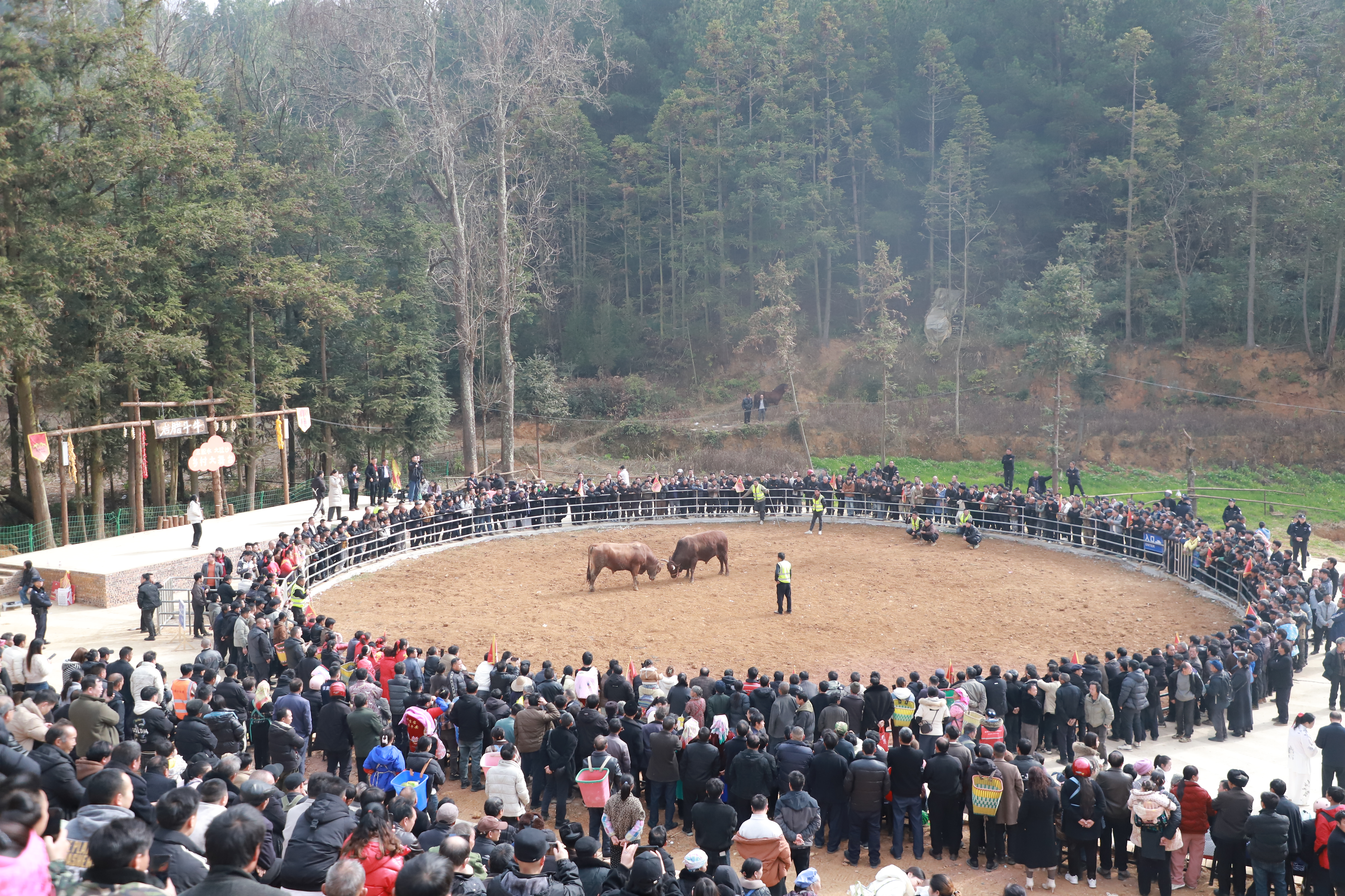 当日上午,随着解说员一声号令,哨声划破长空,两头斗牛奋勇出击、四角相撞,力量的碰撞激起阵阵尘土,引得观众席上呐喊声、助威声此起彼伏,现场气氛热烈非凡。