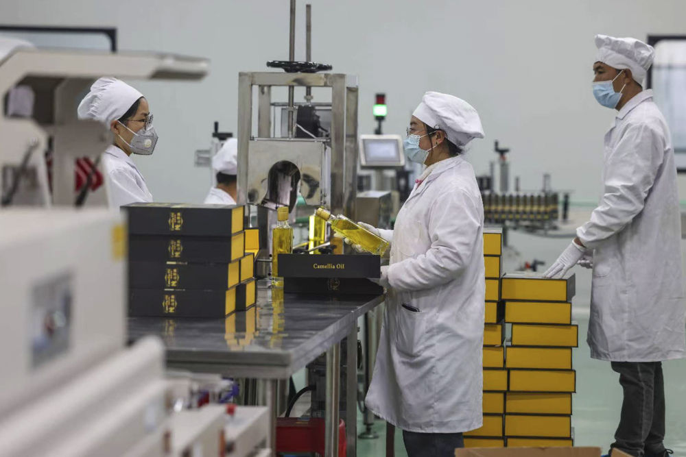 2025年12月24日,在贵州省铜仁市玉屏侗族自治县,工人在生产车间加工茶油。新华社发(胡攀学 摄)