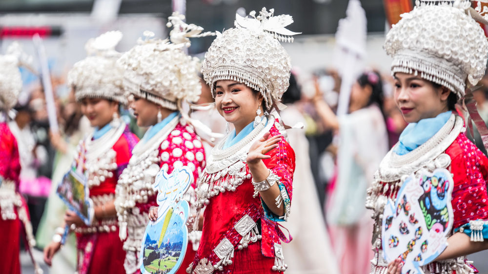 2025年5月18日,贵州民族团结大巡游活动在贵州省贵阳市举行。这是表演队伍在巡游中。新华社记者 陶亮 摄