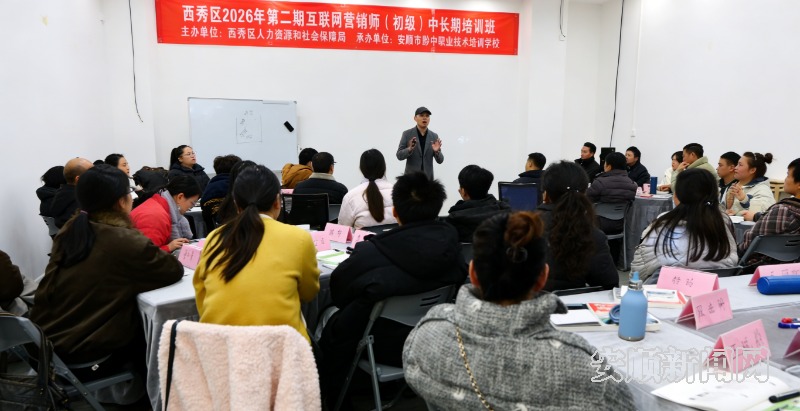 近日,由西秀区人力资源和社会保障局主办、安顺市黔中职业技术培训学校承办的2026年第二期互联网营销师(初级)中长期培训班正式开班,36名学员齐聚课堂,开启为期15天的电商直播技能学习之旅。